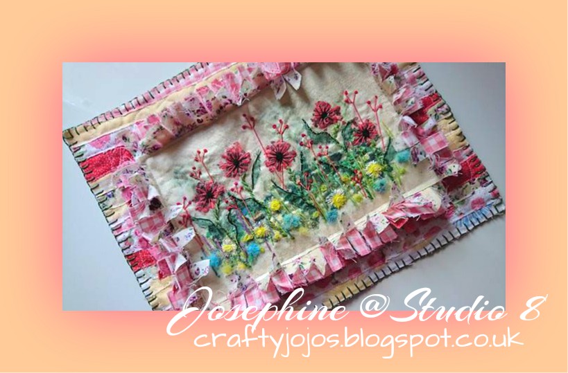 The background for the embroidery was made using tiniest little scraps of fabrics in combination with bondaweb , silk strands, glitter, organza, wax crayons and many other textured materials, too.